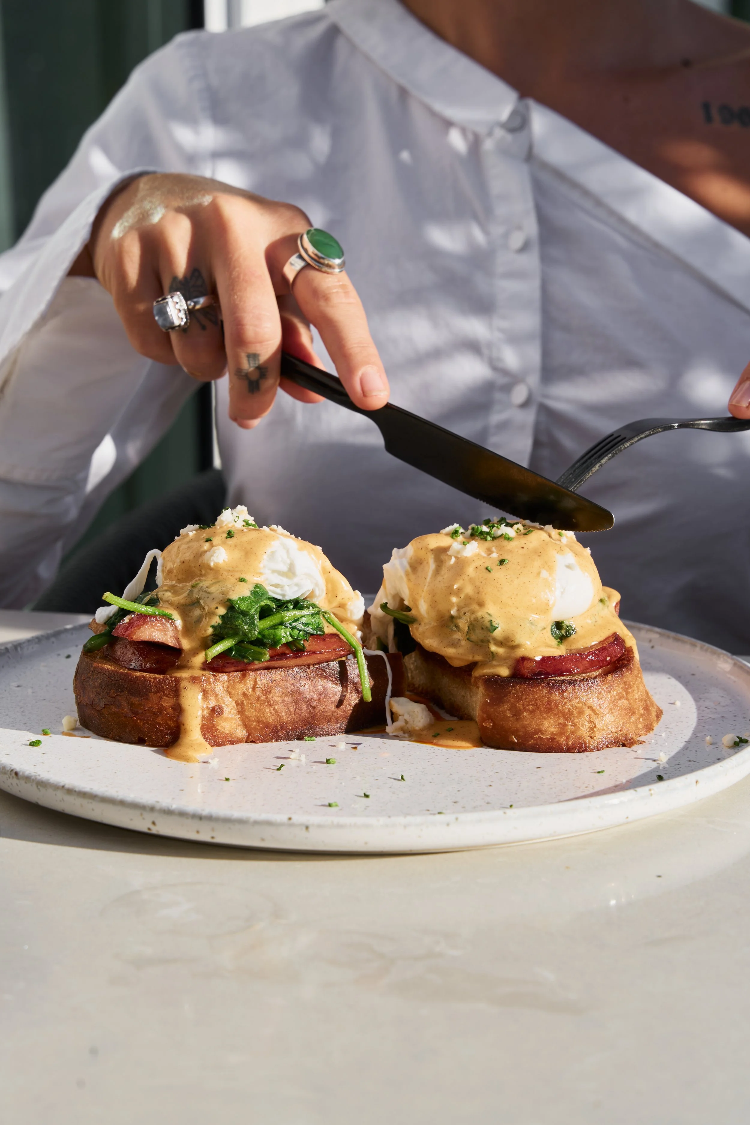 milk bread, duroc ham, baby spinach, brown butter holly